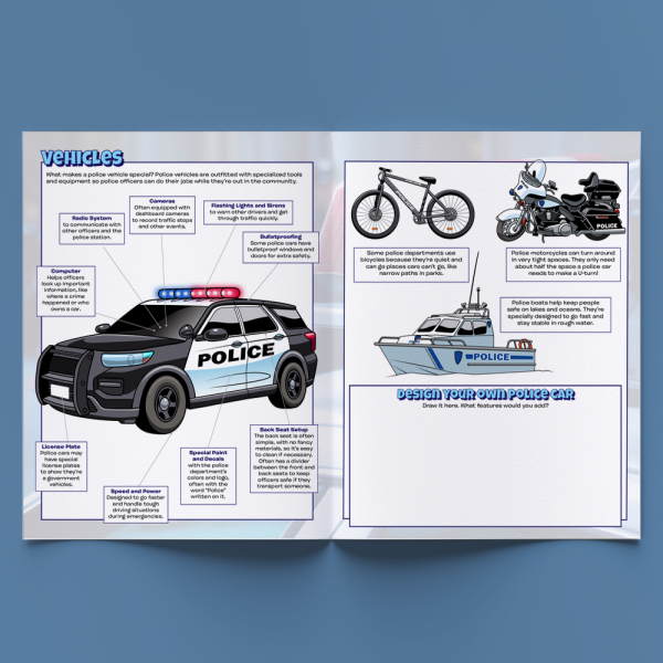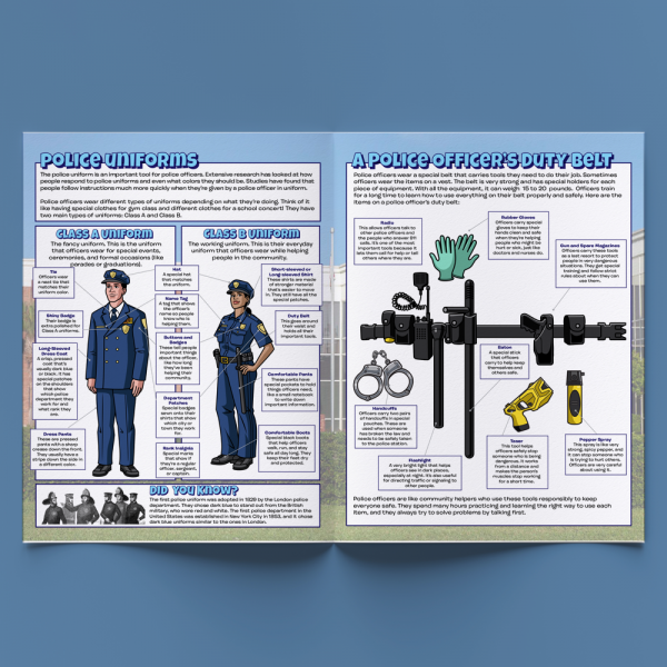 An in-depth look at what police do, designed for older elementary students.  This full-color activity book covers uniforms, equipment, vehicles, and more.